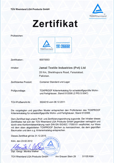 OEKO TEX 100 Certification: Achievement of OEKOTEX 100 Certificate, validates Jamal Textile,Inc commitment for using human friendly dyes and chemicals in product manufacturing.